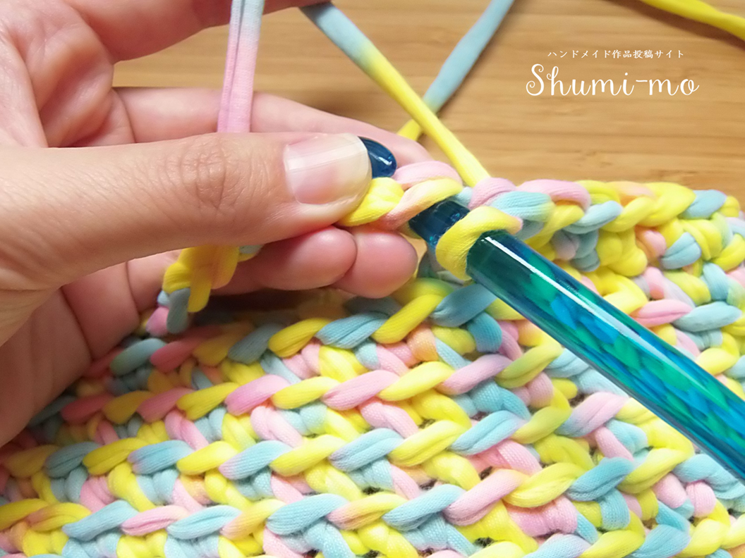 ⑤1目鎖編みで立ちあがって細編みしていきます。ここからは長編みが好きな人は長編みでもOK。好きな深さになるまで繰り返していきます。