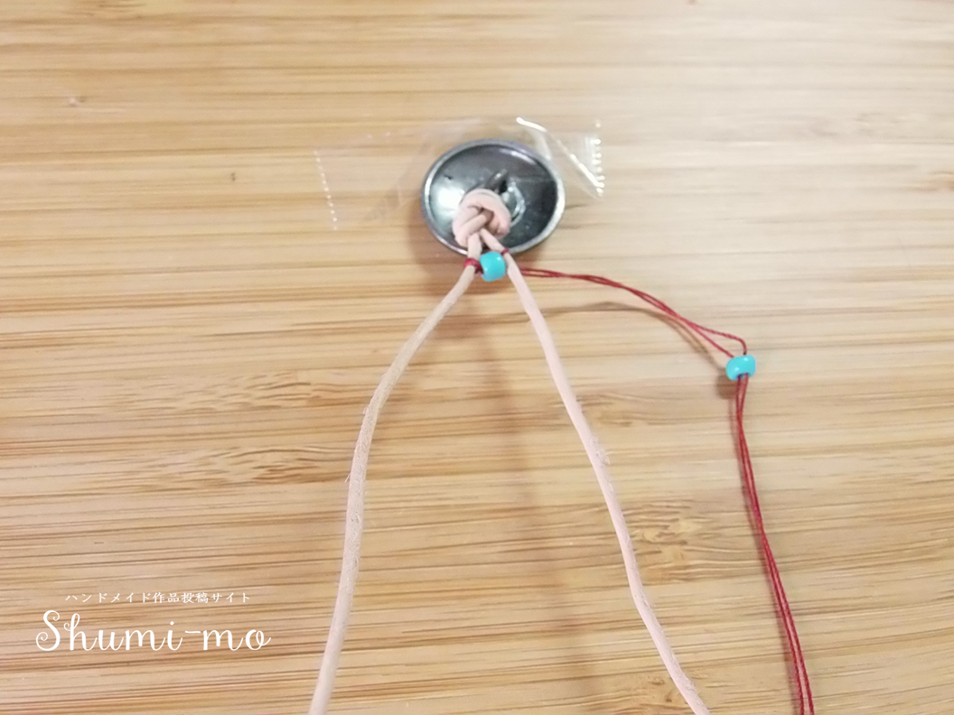 ⑨最後はビーズのすぐ下と、ボタンが通る位置で結びます。余った紐はカットします。