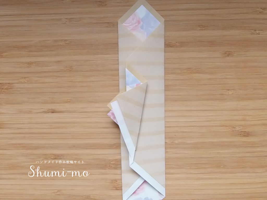 ③そのまま折り返します。折り返す場所は先端の三角が少しはみ出るくらいがバランスが良いです。